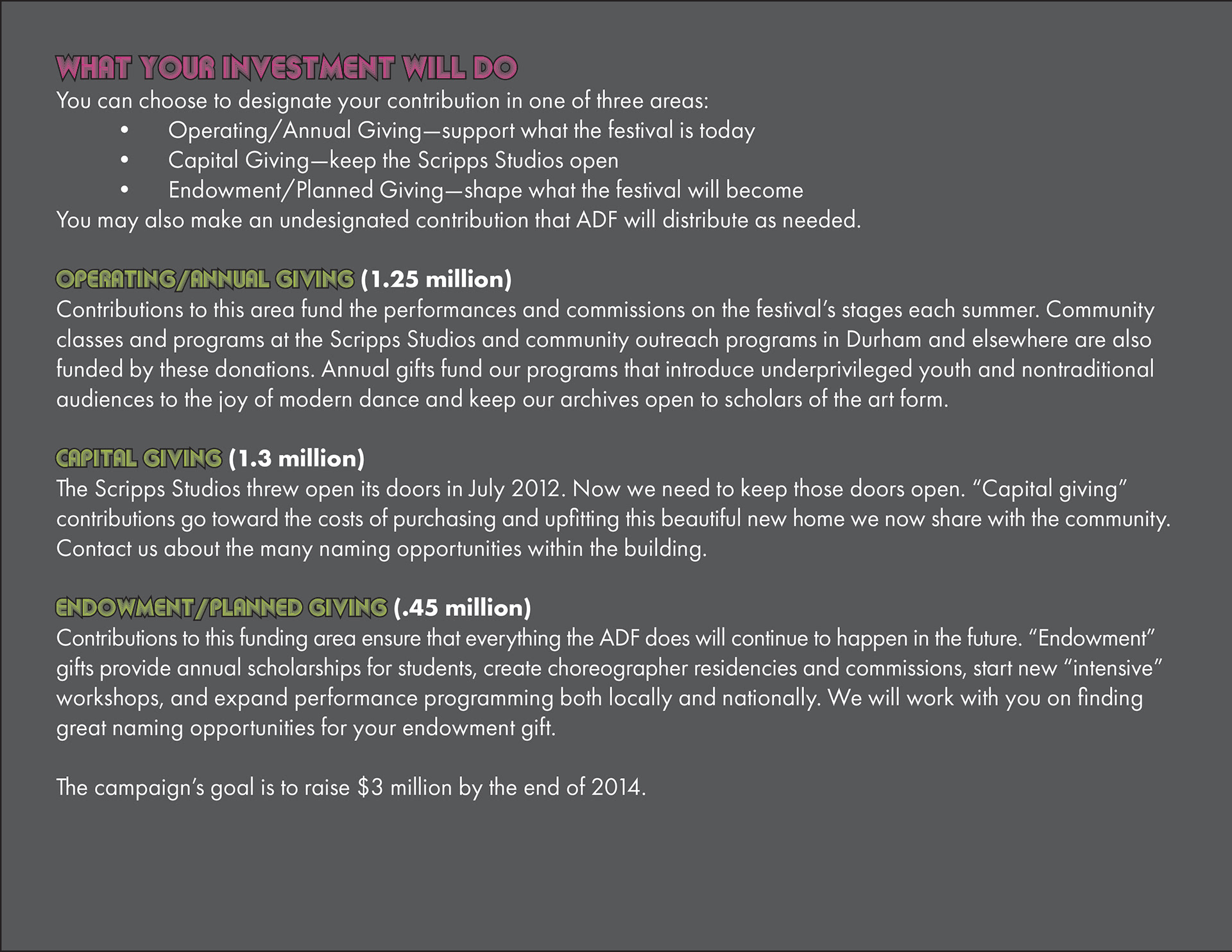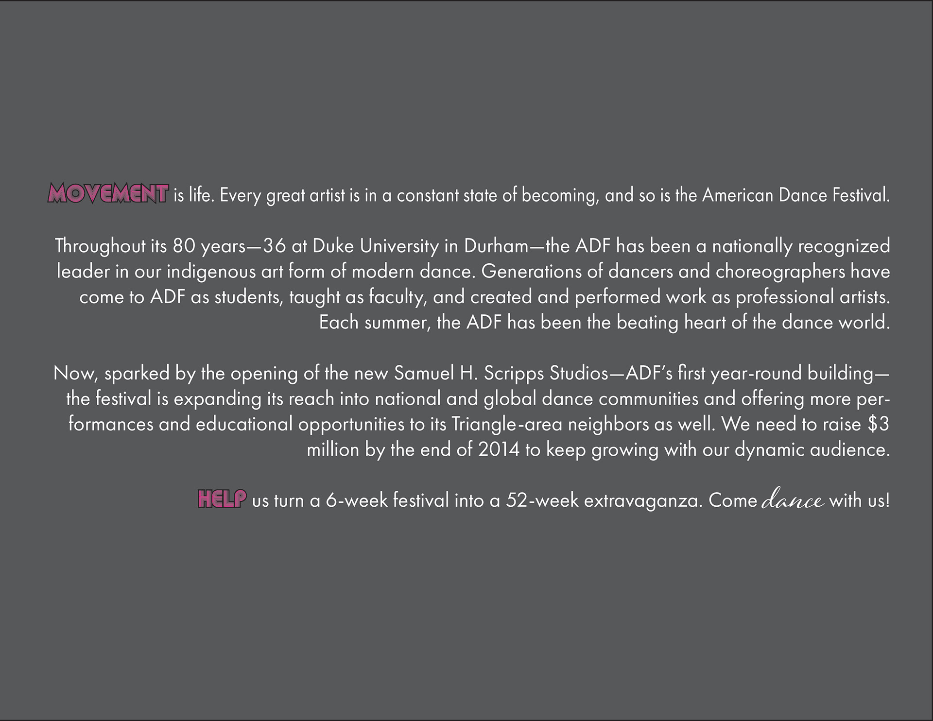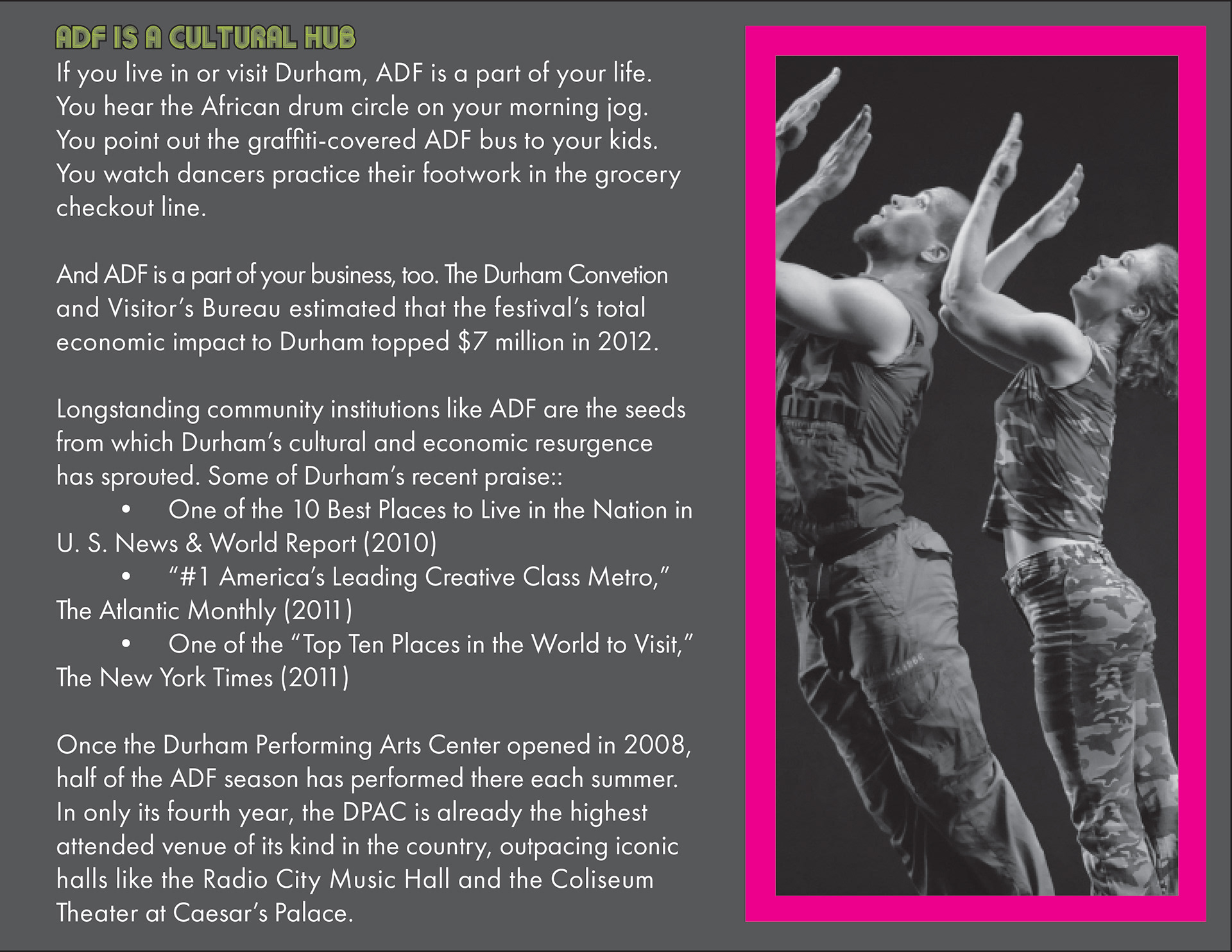 A class project to redesign a brochure for the American Dance Festival (ADF) In Durham. We were given all the photos and text to include in our design. I chose the colors I did based on the ADF website.